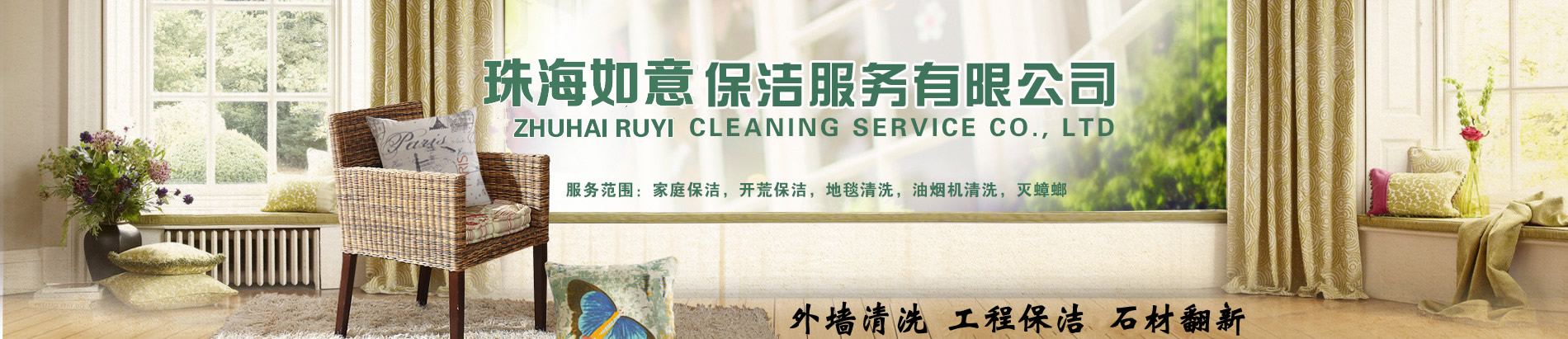 珠海市如意清潔主營:外墻清洗、地毯清洗、石材護理翻新、企業(yè)保潔、開荒清潔、屋面防水、油煙管道清洗。家庭保潔,物業(yè)保潔,小區(qū)物業(yè)保潔,樓盤開荒,沙發(fā)清潔,地板打蠟,(建筑、汽車玻璃貼膜)。
